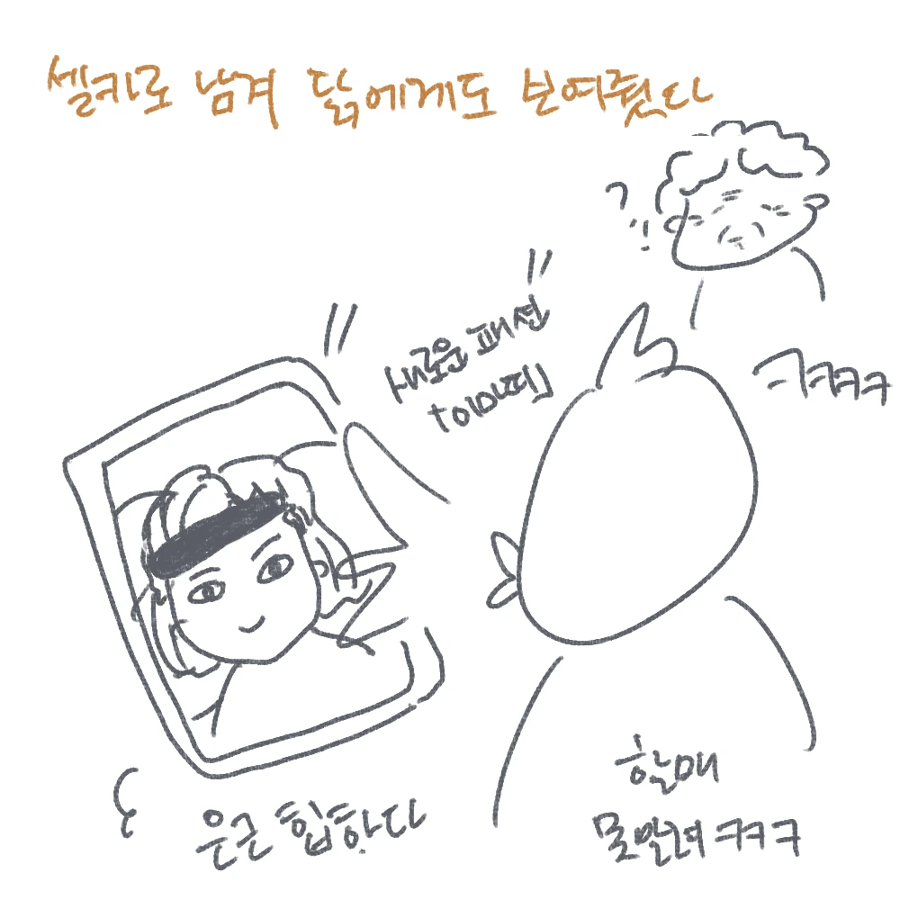 닭에게 할머니가 오늘 아침에 이랬다 하는 썰을 풀면서, 이마띠(?)가 되어버린 머리띠와 함께한 셀카를 닭에게 증거로 보여주자 동시에 빵 터졌고, 옆에서 은근슬쩍 본인이 등장하는 우리의 대화에 안 듣는 척, 귀를 기울이시던 할머니도 우리를 따라 멋쩍게 웃는다. 닭에 따르면 '세상에서 본인이 제일 웃긴 할머니'다. 할머니의 웃음 끝엔 내가 또 한 건 했다는 뿌듯함이 서려있다.