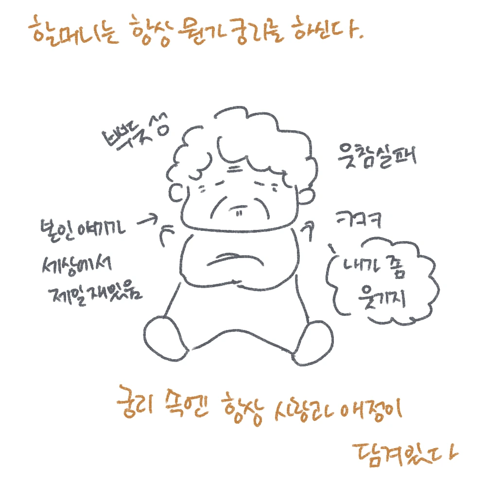 우리 할머니는 참 재밌는 할머니다. 보통 할머니가 아니다. 부모님들이 자식의 웃긴 에피소드를 공유하듯이, 나와 닭만 알고 있기 아까운 에피소드를 공유하고 싶어 이 글들을 쓰게 된 것도 있다. 좋고, 재밌는 경험을 나누고 싶은 마음이랄까. 직접 봐야 하는데 글로만 전할 수 있어 아쉬울 따름이다. 어쩌면 우리에게만 웃긴 일들일지도 모르지만, 우리 할머니는 엉뚱하기도 하고, 한참 귀여울 나이 80대다. 그리고 할머니의 고민 속에는 항상 우리를 향한 애정과 사랑이 담겨있다.