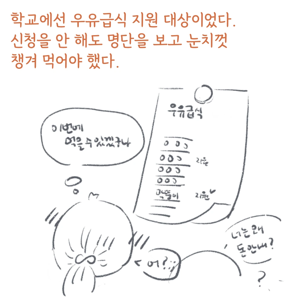 나는 운이 좋게도 그래도 저소득층 어린이를 위한 복지가 점차 확대되고 있던 시기에 태어나 학교 우유 급식을 무료로 먹을 수 있었다. 하지만, 어느 누구도 그런 사실을 따로 알려주거나 하진 않았고, 알려 준다 하더라도, 칠판 게시판에 우유 급식 명단에 표시가 공개적으로 따로 되어 있곤 했었다. 그래서 우유 지원 대상인 걸 알았지만, 학기 초반에는 긴가민가 했으므로 눈치껏 우유를 먹어야 했었다.