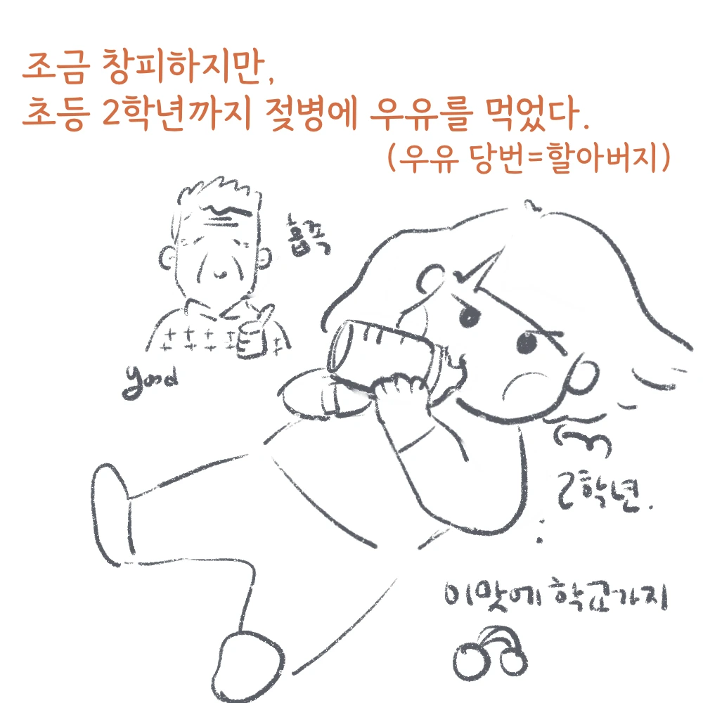 나는 우유를 좋아한다. 그래서 커피 중에 라떼를 가장 좋아한다. 이런 우유 사랑은 어렸을 때로 거슬러 올라간다. 나는 초등학교 저학년까지 우유를 달고 살았는데, 초등학교 2학년 때까지 (집에서는) 젖병에 담긴 우유만을 고집했다. 아침에 등교할 시간이 되면, 할아버지는 분주히 우유를 젖병에 담아 따뜻하게 데워 오셨고, 나는 누워서 그 우유를 먹다가 젖병을 탁 던지고, 황급히 통학차를 타러 달려갔다고 한다. 그리고 밤에는 내가 ‘할아버지, 잠 와’라고 하는 소리에 할아버지께서 엉금엉금 전자레인지로 돌린 따뜻한 젖병 우유를 갖다 주셨고, 그걸 먹다가 잠이 들곤 했다고 한다. 조금은 창피하면서도 따뜻한 이런 기억이 한 켠에 남아 있는가 하면, 또 다른 한 켠에는 우유 급식에 얽힌 시린 기억이 있다.