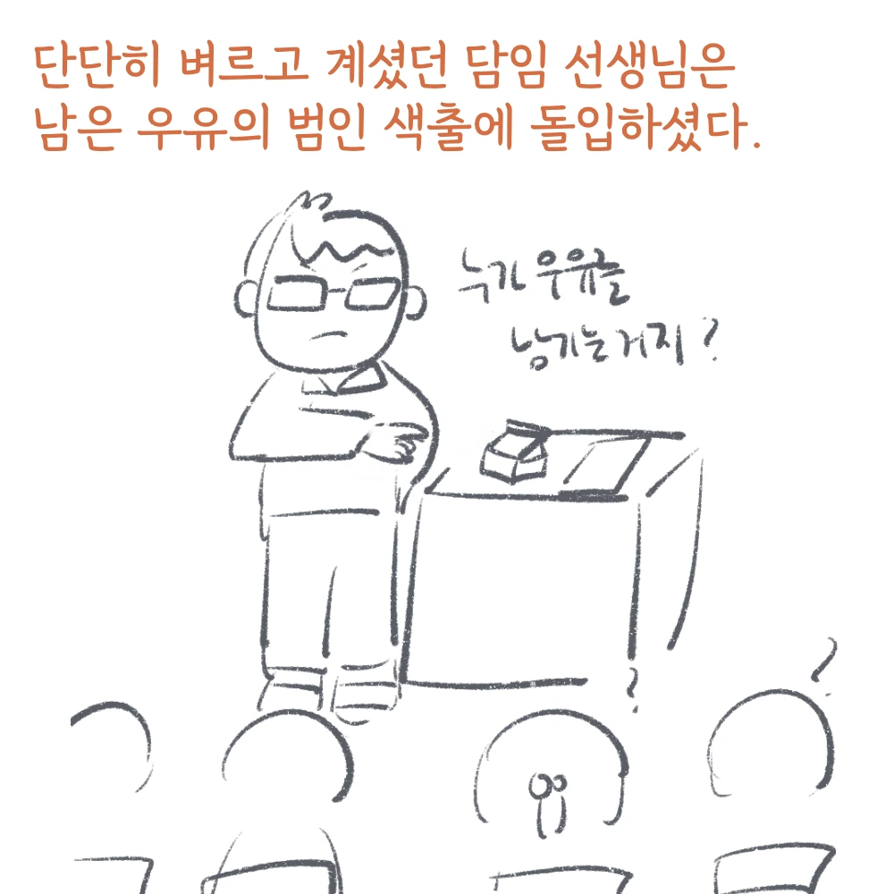 그날 하교 전 종례 시간이었던 것 같다. 유쾌하셔서 아이들에게 인기가 많았지만, 무서울 때는 무서웠던 담임 선생님은 매서운 목소리로, 우유 급식을 남기는 아이를 나무라셨는데, 나는 처음에는 나랑은 상관없겠거니 했다가 점차 불안함을 느끼게 되었다. 선생님은 그 범인 색출하고자 급기야 우유 급식 명단을 가져오셔서 한 명씩 이름을 부르며 먹었는지 안 먹었는지, 공개 처형하셨고, 그 남은 우유의 주인은 나인걸로 밝혀졌다.