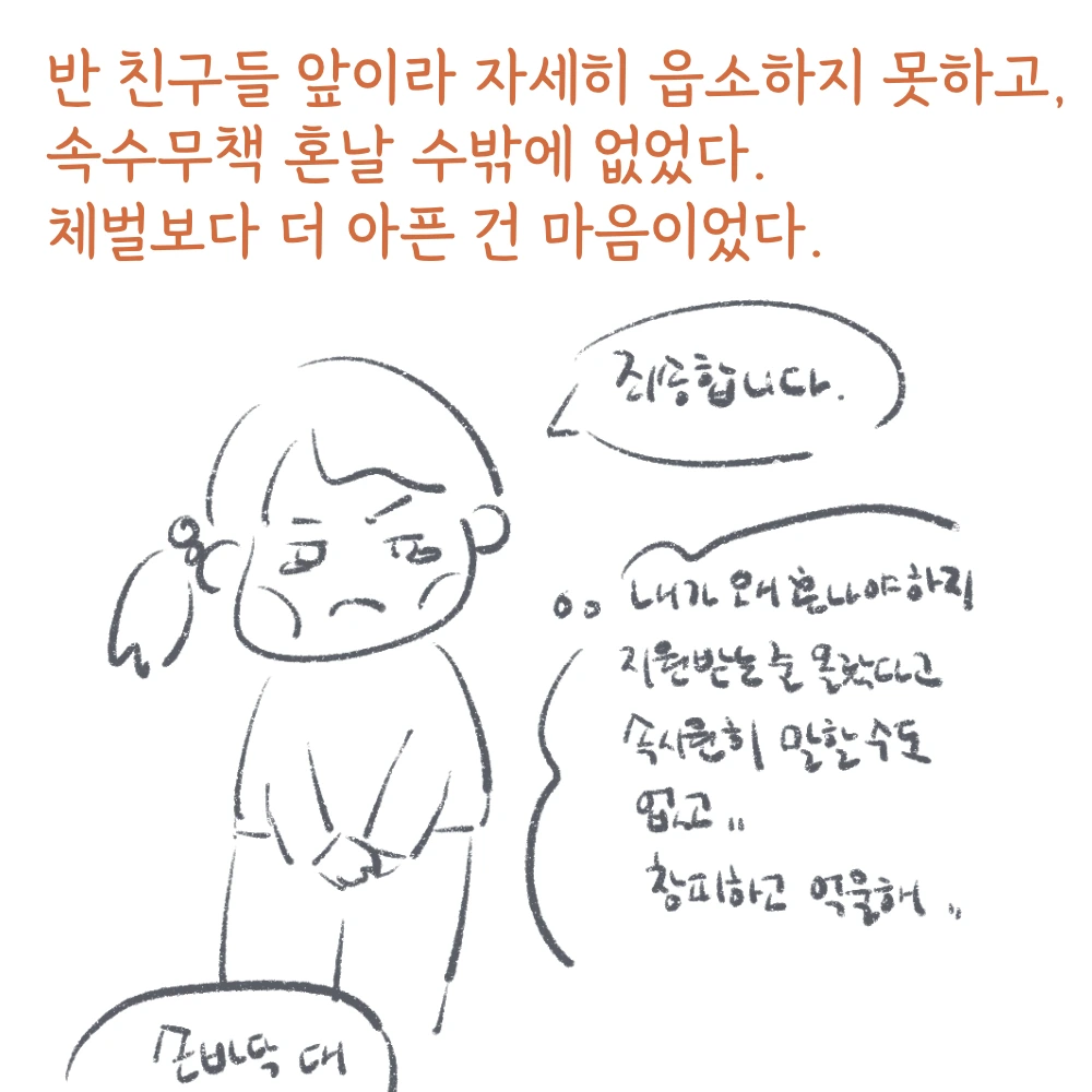 어렸을 때에는 어리다는 이유로, 내가 하지 않은 일들에 대해 누명을 쓰고 혼나는 기억들이 하나씩은 있는 것 같습니다. 저도 그런 기억이 몇 가지 있는데, 반 친구들에게 ‘너는 왜 그렇게 착해?’라는 말을 종종 듣던 내성적인 어린이였던 저도 억울하게 혼나는 일들이 종종 있었고, 그것은 제 환경과 무관하진 않았어서, 더 아리게 기억되는 것 같습니다. 반면교사라고, 이런 상처들을 부정적인 감정으로만 남기지 말고, 거기서 더 큰 사람으로 성장할 수 있는 계기로 삼길 저 스스로에게 다짐합니다.