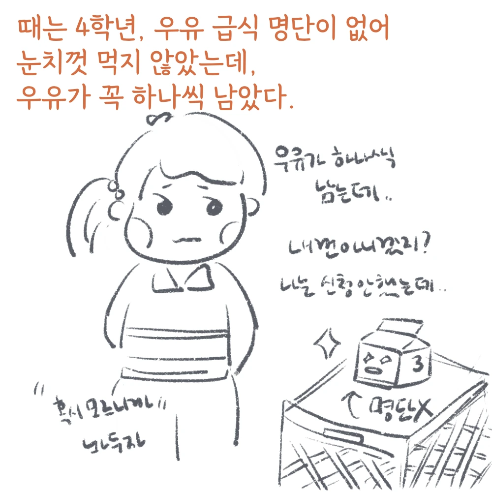 매년 지원을 받는 걸 알면서도 학기 초는 따로 명단이 없으면 내가 다른 친구의 우유를 먹어버리는 게 될까 봐 늘 조심스러울 수밖에 없었다. 저학년에서 고학년이 되었던 4학년, 새 학기 그때도 그러했다. 심지어 그때는 개수만 알 수 있지, 우유 급식 명단이 따로 없었어서 우유를 먹고 싶었지만, 먹지 않았었다. 그렇게 우유가 꼭 하나씩 남게 되었고, 담임 선생님은 우유를 남기는 괘씸한 학생을 찾으러 벼르고 계셨다. 그런 사실을 까맣게 모르던 나는 심판의 날에 모든 내막을 알게 되었다.