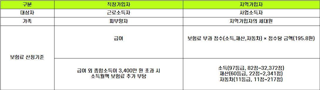 건보료 부과 체계는 직장가입자와 지역가입자가 차이가 납니다. 보험료율(6.46%)에서 직장가입자는 회사와 가입자가 절반씩 나눠서 부담을 합니다. 지역가입자는 소득 점수 재산 점수가 모두 건강보험료 산정기준이 되므로, 직장가입자보다는 보험료 부담이 많은 편입니다.