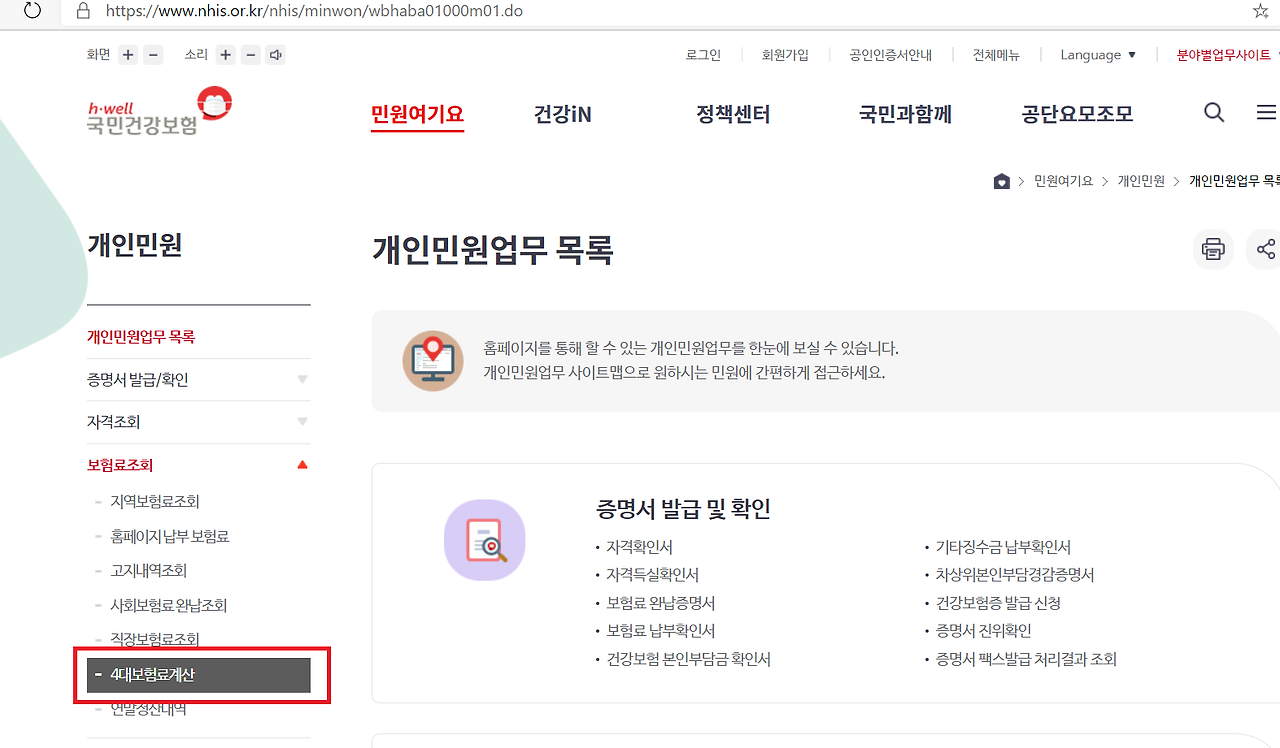 건강보험료는 국민건강보험 홈페이지(https://www.nhis.or.kr/) 민원 여기요 – 개인 민원 - 보험료 조회 – 4대 보험료 계산 화면에서 소득과 재산과표를 넣으면 모의 계산해 볼 수 있습니다.