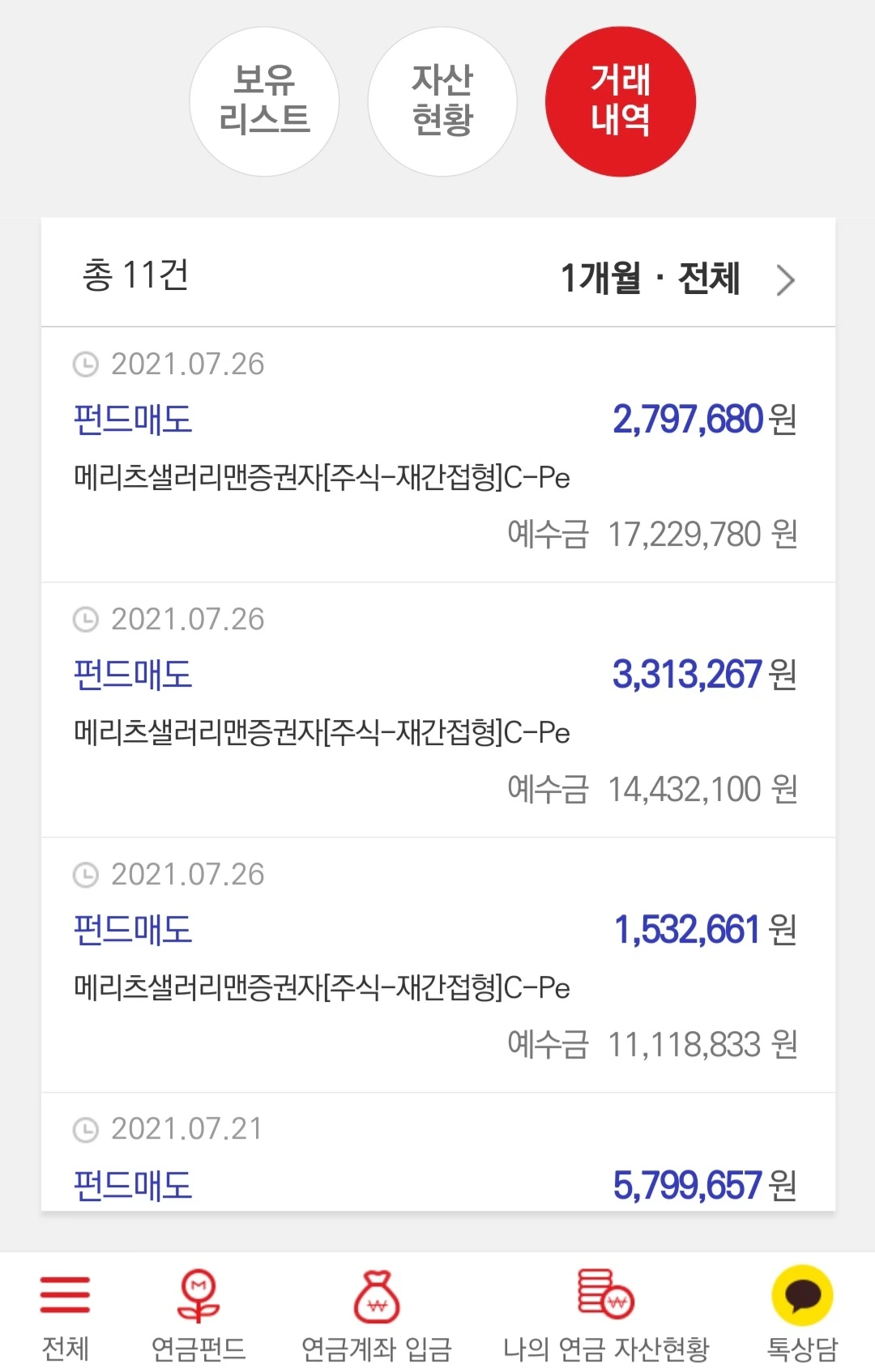 요렇게 펀드 매도를 하나씩 다 하고, 예수금 형태로 갖고 있었습니다! 계좌 이전 신청하면 자동으로 다 해주지만 제가 직접 하나씩 했습니다. 안녕 아가들!