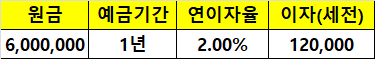 년 600만 원짜리(50만 원 X 12개월로 환산한 돈) 1년 만기 예금의 세전 이자는 120,000입니다.