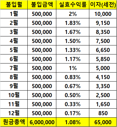 월 50만 원짜리 1년 만기 적금의 세전 이자는 65,000입니다.