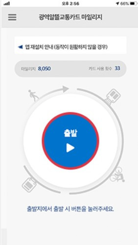 실물 교통카드로 태그를 하고, 광역 알뜰 마일리지 어플을 열어 출발과 도착을 눌러야 합니다.