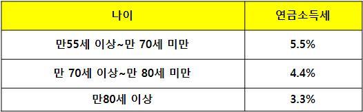 우리나라 이자소득세, 배당소득세가 15.4%죠. 이 부분을 제하지 않고, 원금이 복리로 굴러가기 때문에 수익률이 높습니다. 과세 이연이라는 말은 세금을 뒤로 미뤄준다는 이야기인데요, 이 밀린 세금은 55세 이후 15.4%가 아닌, 낮은 3.3%~5.5%의 연금소득세를 냅니다. 수령 연령에 따라 세율이 달라집니다. 세액공제받고, 연금소득세를 내잖아!라고 말할 수 있겠지만, 연금소득세 내기 전에 자산을 많이 불려놓으면 되지요!