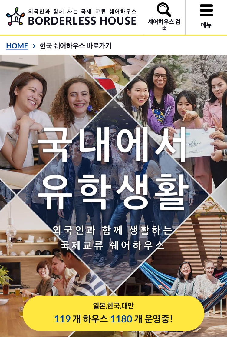 2. 보더리스 - 셰어하우스와 관련된 기사에서 거의 빠지지 않고 등장하는 서비스가 위에 언급된 우주와 지금 설명드리는 보더리스입니다. 보더리스는 2007년에 설립된 일본 회사로서 서울 법인은 2012년에 설립 되었습니다. 현재 서울에 23개 지점을 포함하여 일본과 대만까지 총 119개 지점을 운영 중 입니다. 초기에 일본에서 ‘외국인과 함께 사는 셰어하우스’를 표방하며 오픈되어 한국에서도 동일한 컨셉으로 운영 중이라 그 컨셉이 다른 어떤 하우스보다 차별화되는 특징을 가지고 있습니다. 언어교환 프로그램, 하우스 익스체인지 등 외국인들과 같이 사는 특징이 없으면 할 수 없는 다양한 소프트웨어도 또한 그 매력을 배가 합니다. 이를 위해 한국인과 외국인의 비율을 특정 비율로 정해고 있으며 이는 일본의 정책을 차용한 것으로써 보더리스의 정체성과 직결됩니다. 다만 벤치마킹 투어 경험에 따르면 공간이나 서비스의 퀄리티는 다른 하우스와 비교할 때 우위를 갖지 못합니다. 그러나 이러한 단점에도 불구하고 강력한 하나의 장점으로 인하여 그 인기는 여전하며 추가적인 성장세는 충분합니다.