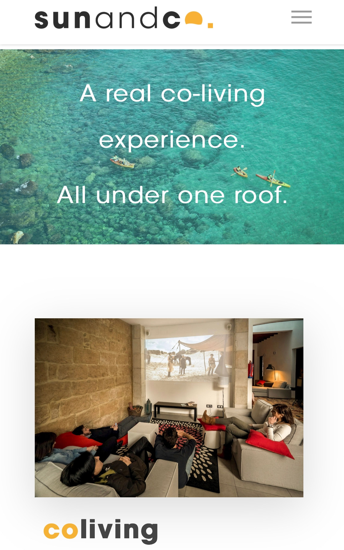 지중해에 있는 최초의 코리빙 서비스 입니다. 스페인의 Javea 라는 동쪽 해변가에 위치해 있으며 프리랜서 등 자유로운 직업을 가진 사람들이 좋은 자연환경에서 일과 함께 라이프를 즐기라는 컨셉으로 시작되었습니다. 선앤컴퍼니 아카데미라는 별도의 법인도 설립하여 교육 사업도 연계하고 있습니다.(주2) 컨셉적으로는 유럽 이외 지역에도 충분히 가능한 비즈니스 모델이나 아직 한 곳에만 있기에 유럽 카테고리에 위치 시켰습니다.