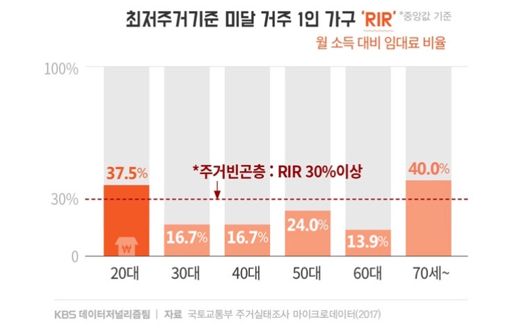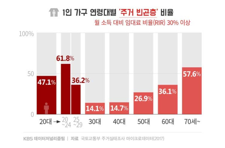 2018년 5월 8일에 국토교통부에서 배포한 2017년 주거실태조사 결과를 보면 청년 가구의 월 소득 대비 월 임대료 비율(RIR) 은 18.9% 로써 일반 가구의 17%에 비해 높다고 하였으나 이태진 한국보건사회연구원 연구위원팀은 청년 가구 중에서 1인 가구의 RIR이 20 이상인 경우가 56.9%, 30 이상도 30%에 달한다고 하여 1인 가구의 경제 상황이 더욱 열악하다는 것을 확인하였습니다.(주3) 게다가 각 연령대별 고시원에 거주하는 비율 중 20대가 11.3%로 가장 높았고 최저 주거기준인 14평방미터에도 미치지 못하는 열악한 곳에 거주하는 비중도 20대가 11.9%로 가장 높았습니다. 특히 최저 주거기준에 못 미치는 곳에 거주하는 인원의 RIR 은 20대가 37.5% 로써(주4) 결국 그러한 열악한 주거 환경도 소득 대비 매우 높은 수준이라는 것을 알 수 있습니다.