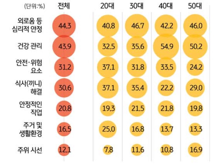 또 한 가지 놓치면 안 되는 부분이 1인 가구의 무형적인 어려움입니다. 1인 생활은 가족 또는 가까운 사람과의 생활에 비해 우려스러운 점이 많습니다. 외로움 등 심리적 안정은 물론 응급상황 등의 건강 관리, 그리고 특히 여성에게 더욱 치명적인 문제인 주거 침입이나 도난, 생활 안전에 대한 문제는 간과할 수 없는 현실입니다. 더욱이 자신에 대한 자존감을 지키기 어려운 부정적 자아상에 대한 문제도 대두되고 있는 현실입니다. 하지만 아직 정부는 이러한 문제를 전면적으로 제기하고 해결하고자 하는 의지를 보이고 있지 않으며 일부의 민간 사업자들만 이 문제를 집중적으로 다루고 있는 실정입니다.