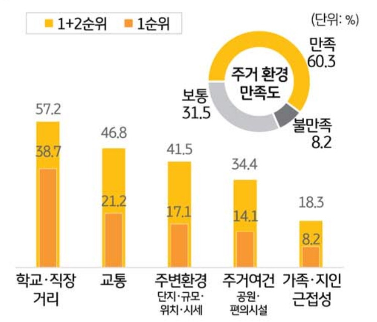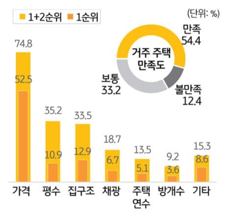 이러한 결과는 1인 가구의 거주주택 선택 사유 중 가장 높은 비율이 가격이고 입지를 나타내는 주거환경 선택 사유의 가장 높은 비율이 학교나 직장과의 거리 또는 교통이라는 결과와 비교해 볼 때, 열악한 것을 알고 있음에도 불구하고 가격이 저렴하고 직주근접을 실현할 수 있는 곳에 어쩔 수 없이 살고 있다는 결론을 추론해 볼 수 있겠습니다.