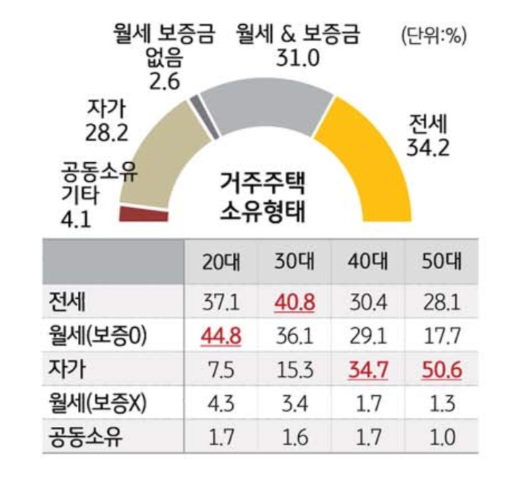 지난 챕터에는 1인 주거의 면적을 살펴보았습니다만 이번 챕터에는 비용에 관련된 내용을 더욱 자세히 보겠습니다. 1인 가구의 자가 비율은 28.2%로써 전체 가구의 자가 비율인 60.7% 보다 현격히 낮습니다. 특히 20대의 경우 월세 비중이 50%에 육박 합니다.(주2)