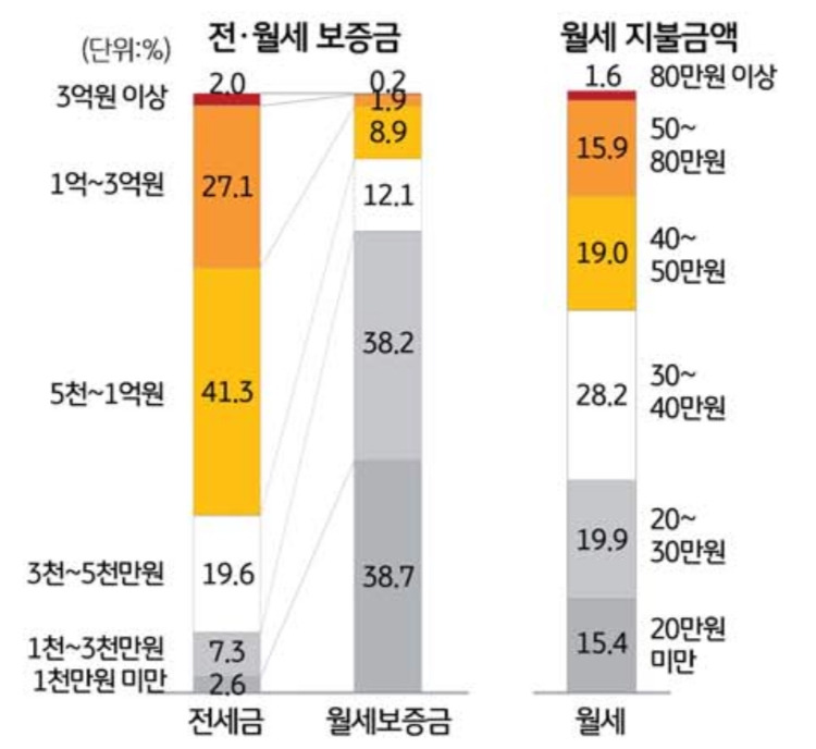 한편, 월세 보증금은 1천만원 미만이 38.7%이고 3천만원 이하는 약 80%에 달했습니다. 월세 지불 금액은 반전세를 포함한 금액이기는 하지만 82.5%가 50만원 이하로 지출하고 있습니다.