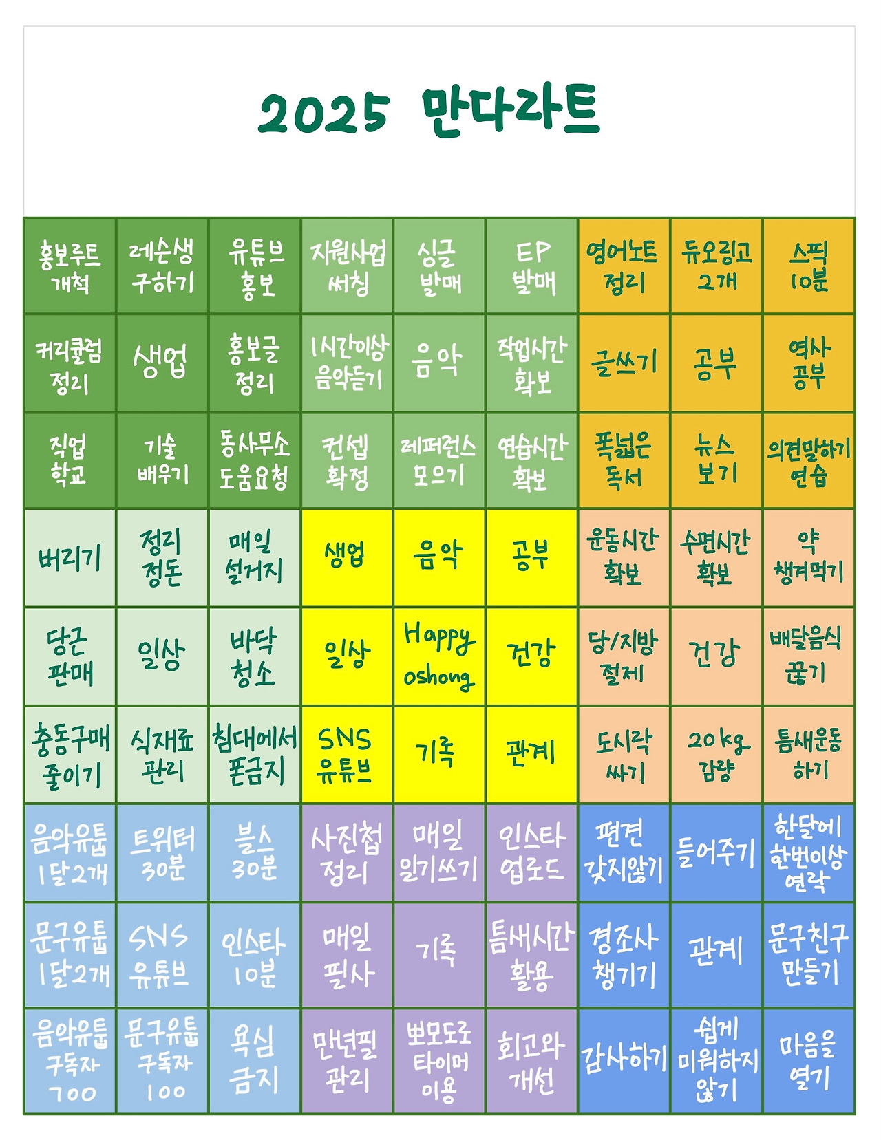 계속 미루고 있던 만다라트를 작성해 보았다. 조금 수정이 필요할 것 같지만 세부계획을 모두 볼 수 있어서 좋은 듯하다. 제일 중요한 목표는 Happy oshong(행복한 오숑)으로 정했고, 지금 내게 필요한 것들을 나열해 보았다. 만다라트를 보면 서로 얽혀있는 많은 것들이 제대로 돌아가야 큰 목표를 이루는구나 깨닫게 된다.