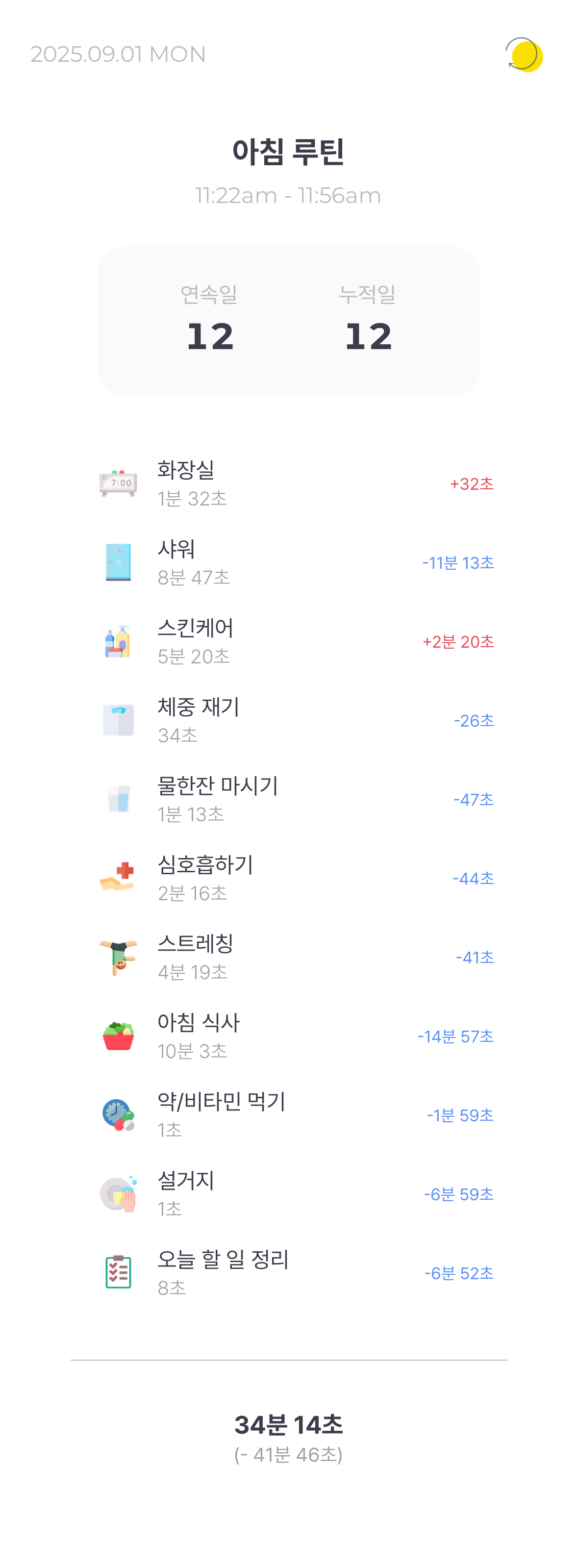 오늘 아침루틴은 건너뛴 것들이 많은데, 늦잠을 자 병원에 가는 시간이 빠듯해 느긋하게 할 수가 없었다. 돌발상황이 있을 때 건너뛰거나 시간 추가를 할 수 있는 것도 이 앱의 장점이다. 정해놓은 시간을 넘기면 몇 분이 지났다고 음성 알람을 설정할 수 있는 것도 좋다. 좋아하는 일을 길게 하다가, 귀찮지만 꼭 하면 좋은 일을 할 시간이 줄어드는 것을 막아준다.