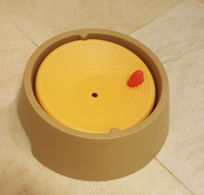 많은 분들이 애용하시는 물그릇일 거라고 생각한다. 제노는 어릴 때 물그릇만 보면 뒤집는 놈으로 악명이 높았다. 정말로 악명이 높아서 제노를 잠깐 호텔링을 맡겨둔다거나 동물 병원에 두면 항상 보드나 비고사항에 대문짝만 하게 '제노 - 물그릇을 끝없이 뒤집음 [제한 급수 필수]'라는 내용이 적혀 있었다. 집에서도 항상 물그릇을 뒤집어대서 나중에는 외출할 때 물그릇이 있는 화장실 문을 닫아놓고 외출해야 할 정도였다. 이 물그릇을 이용하기 전에는 항상 물에 코를 박고 온 집을 돌아다녀서 하루 종일 쫓아다니며 주르륵 흐른 물자국을 닦아야 했다.