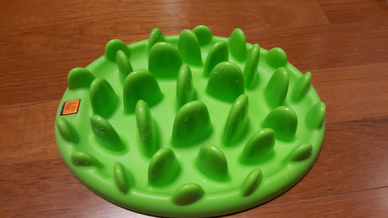 어디서 샀는지 어떤 제품인지는 전혀 기억이 안 난다. 대부분의 견종들이 그렇지만 허스키 역시 어릴수록 식탐과 식욕이 엄청나다. 밥을 주면 먹기 시작하는 게 아니라 "내 거야!!!!!"하면서 밥그릇에 뛰어든 다음에 촤라락~ 클레이모어처럼 흩어진 밥알들을 하나씩 뛰어다니며 주워 먹기 시작한다. 완전히 식사 습관을 들이기 전에는 최대한 무겁고, 깊고, 하단에 고무 지지대가 달려 있어 쉽게 움직이지 않는 밥그릇을 이용하시길 권장한다. 물론 식사 습관이 다 들고 성견이 된 후에는 돗자리에 사료를 깔아놔도 멀뚱멀뚱 바라만 볼 테지만...