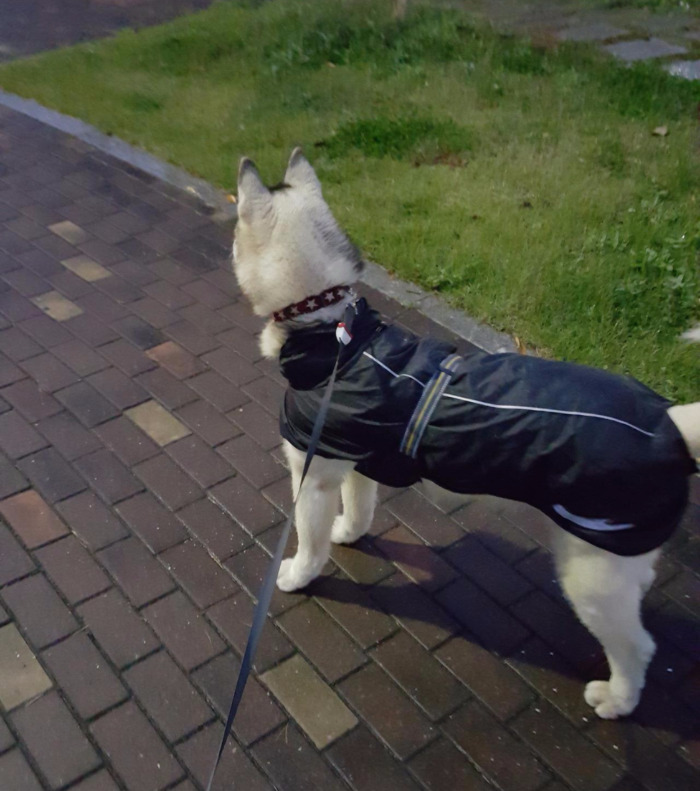 제노가 착용하는 우비는 후르타(Hurtta) 제품으로 사진에는 잘 보이지 않지만 양 뒷다리에 밀착면을 고정하기 위한 고무줄이 장착되어있다. 또한 하네스를 착용할 경우를 대비하여 등 위쪽으로 리드 줄을 연결할 수 있는 구멍도 마련되어 있다. 아무리 우비라고 해도 배와 다리 쪽까지 덮는 것은 아니므로 우천 속에서 30분 이상 산책을 하면 배 쪽이나 다리 쪽은 흠뻑 젖어서 귀가하게 된다. 따라서 반려견 전용 우비란 저체온증을 방지하고 털이 빽빽하여 물기를 말리기 어려운 녀석들이 완전히 물에 빠진 꼴을 면하게 해주는 고마운 도구 정도라고 생각하면 좋다.