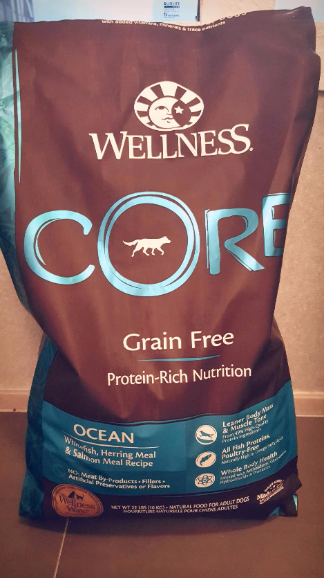 상표는 웰니스코어 오션포뮬라이다. 생선을 주원료로 한 고단백 사료로서 제노에게 급여해 본 결과 소화에도 가장 무리가 없었으며 피모의 질 개선이나 영양적인 부분에서도 가장 뛰어났다. 약 12개월령까지는 웰니스코어의 퍼피 사료를 먹였으며 성견이 된 이후로는 몇몇 사료들과 함께 테스트 과정을 거친 후 오션포뮬라에 정착하게 되었다. 성견이 되기 전에는 퍼피 사료를 아침, 저녁 두 차례 각각 종이컵 기준 2컵반씩 급여를 하였다. 성견이 된 이후로는 점차 식욕, 식탐이 눈에 띄게 줄었고 매일 저녁 한 차례만 사료를 급여하기 시작했다. 약 13~14개월령부터는 주 사료인 오션포뮬라와 관절 보조사료를 3.5 : 1 정도의 비율로 섞어 급여했다. 알로페시아 증상이 나타난 이후부터는 피모 영양보조제를 함께 뿌려서 급여하고 있지만 사실 사료의 영양 구성이 워낙 뛰어나기 때문에 특별히 피모에 문제가 있지 않은 한 좋은 사료만 먹여도 무방하다고 생각한다.