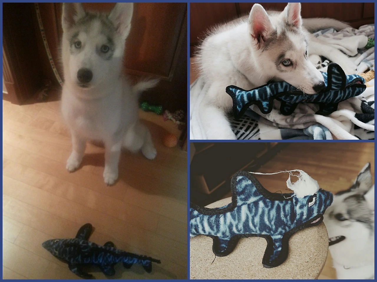 또 다른 인상 깊었던 장난감으로는 상어가 있다. 세상에서 가장 튼튼한 애완동물용 장난감을 만든다고 자부하는 어느 회사의 야심작 봉제인형 중 하나로, 10까지의 내구도 수준 가운데 7에 해당하는 튼튼한 녀석이었다. 상어는 호랑이보다 더욱 긴 약 3개월을 버으나 뇌수가 튀어나와 운명을 다했다. 이마 약점이라는 사실을 어떻게 간파했는지는 모르겠다. 첨부한 사진을 보면 사망한 상어 뒤로 제노가 상당히 악질적인 미소를 띠고 있는 장면이 보인다. (사냥 성공! 크하하) 이틀 전에는 같은 종류의 장난감 중 내구도 9로 분류되는 불가사리운명했다. 장난감들을 만드는 회사의 홍보영상에는 내구도 8짜리 장난감을 가지고 노는 사자와 호랑이, 그리고 곰이 등장한다. 완력은 부족하지만 철저하게 약점만을 공략한 제노는 혹시 천재?!