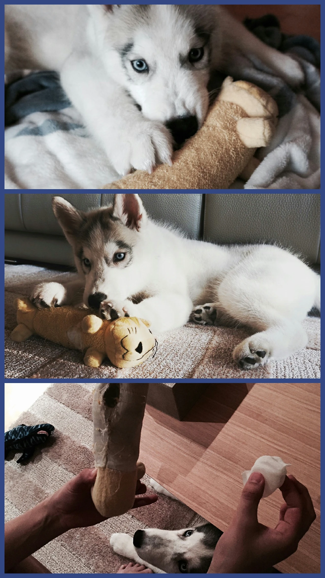 제노와 함께하면서 지출한 금액 중 사료값 다음으로 많이 들어간 것이 바로 장난감다. 반려견이 장난감을 잘 가지고 노는 모습은 견주의 행복이기도다. 다만 이는 어디까지나 장난감이 버텨낼 경우의 이야기일 것이다. 제노가 생후 3~4개월을 넘기면서부터 그때까지 갖고 있던 장난감들을 하나 둘 씩 파괴하기 시작했다. 오리, 기린, 도마뱀, 상어, 불가사리, 밧줄매듭, 고무공, 테니스공 등... 일방적인 학살이었다. 지인들이 큰 맘 먹고 선물해준 비싼 장난감들은 사흘 만에 목 윗부분이 다 터지고 풀려, 터뜨리고 난 폭죽처럼 되어버렸다. 잘 갖고 놀 수 있는 장난감을 선물해줘서 감사하다고 전해야 할지, 아니면 벌써 이렇게 되어버려 미안하다고 사과를 해야 할지 알 수 없는 상황이었다.