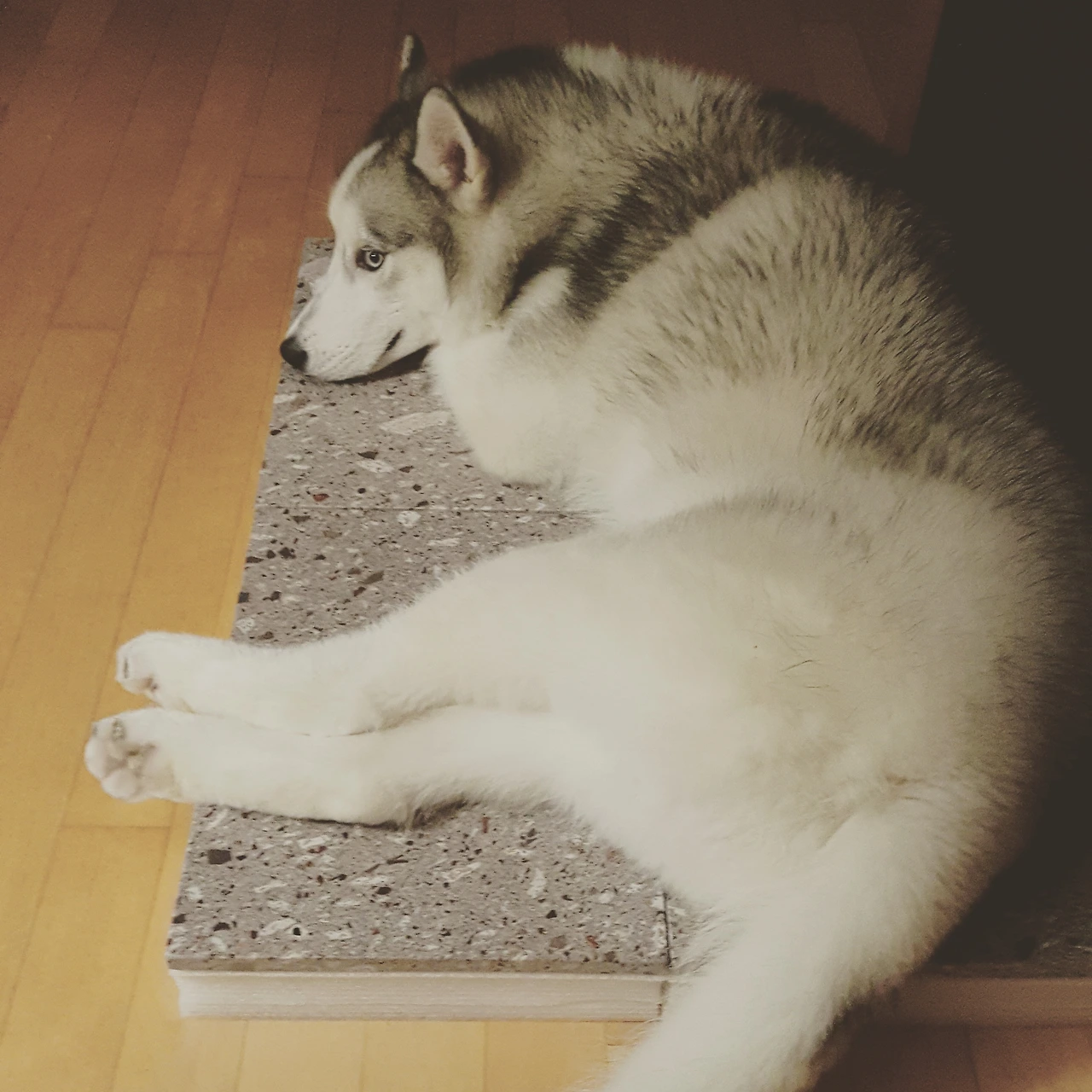 방문을 닫고 들어가지 않으면 제노는 항상 발치에 와서 잠에 든다. 아무리 저쪽에 시원한 냉돌침대가 있어도, 그곳에 선풍기가 돌아가고 있어도, 헥헥거리면서 더위를 참는 한이 있어도 아빠나 엄마의 발치가 바로 자기가 누울 곳이라고 생각하는 모양이다. 이 사진은 바로 이 글을 작성하면서 의자 아래에 곤히 잠든 제노의 모습과 셔터 소리에 잠시 눈을 떠서 올려다보는 제노의 모습이다. 더 어릴 적엔 이렇게 자면서 코도 골고 방귀도 뀌는 바람에 작업실 공기가 혼탁해졌는데 요즘은 그런 생리현상이 현저히 줄어들었다(왜인지 모르게 조금 아쉽다).
