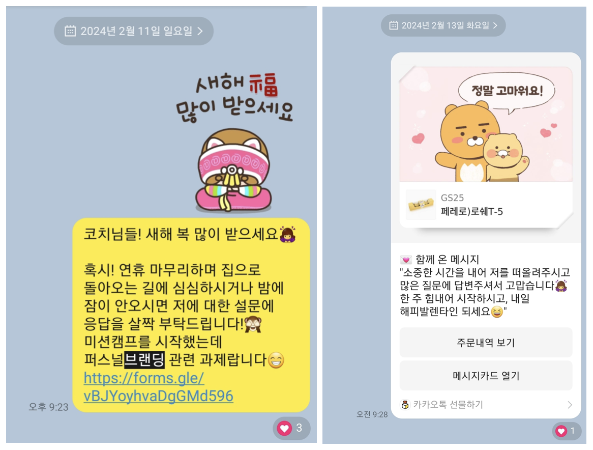 미션캠프를 진행하며 남은 보물 중 하나는 나에 대해 사람들에게 들어보기 과제로 몇 가지 질문을 담은 설문으로 받은 응답들이다. 설연휴를 마무리하며 급히 진행했던 설문에 시간을 내어 응답해주신 분들의 소중한 기록. 다른 인연으로 만난 분들임에도, 공통적으로 적어주시는 키워드들이 있음이 신기했다. 따스함, 다정함, 배려, 성장, 성실, 꾸준함, 지혜. 에너지가 떨어졌을 때 한번씩 꺼내 읽어보면 미소를 지으며 잠시 잃었던 나를 회복하게 된다. 다시 한번 감사의 마음을 전하며 글을 마무리 한다.