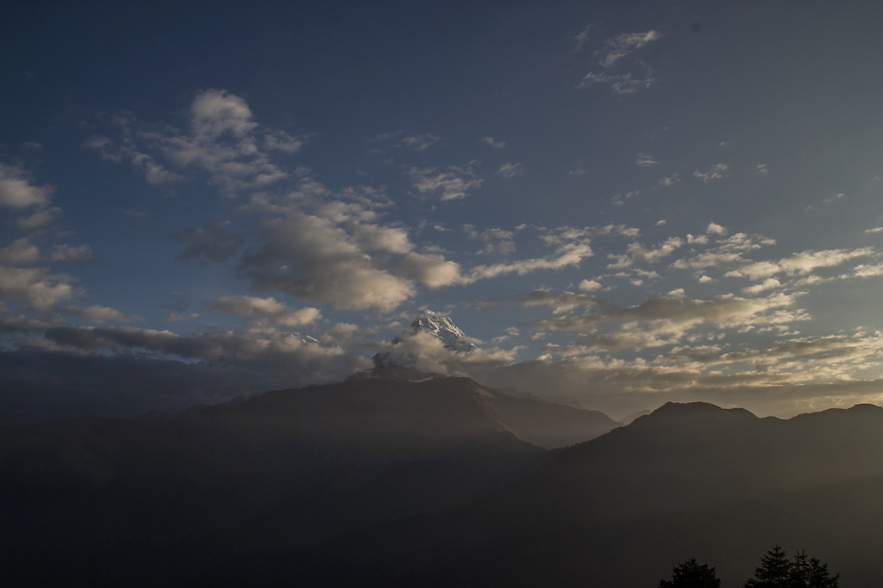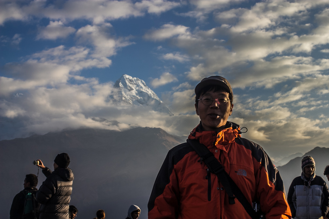 전망대 위로 올라서도 사진을 담아보지만 날씨가 우리를 허락하지 않았다. 날씨가 아예 안 좋으면 전망대에 구름이 앉아서 그 나름대로 또 장관이라던데 이도 저도 아닌 날씨에 우리 일행은 약간 실망해 가고 있었다. 뭐, 그래도 사람들은 해 뜨는 거 좋다고 '오이, 오이'를 외치며 좋아하고 있었다. 해가 고개를 빼꼼 드러내기 시작할 무렵, 해 때문에 기온이 올라가서인지 구름의 움직임이 빨라지기 시작했다. 안나푸르나 산군 중 몇 봉우리가 모습을 드러내고 있었다. 결국, 안나푸르나는 나에게 모습을 허락했다. 비록 전 산군은 아니라 안나푸르나 1봉이었지만. 물론 구름은 아주 잠깐 우리를 허락했고, 서서히 그 모습을 감추기 시작했다.