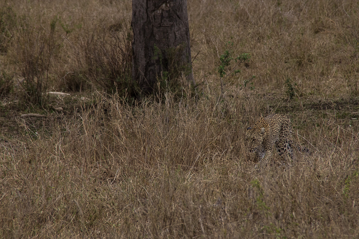 몇 가지 기억에 남았는 장면들만 소개해보겠다. 먼저 가장 긴박했던 순간 중 하나였는데, 넬리가 무전을 듣고 급하게 이동하기 시작했다. BIG 5 동물 중 완성하지 못했던 표범을 볼 수 있다는 무전이 왔기 때문이다. 표범이 정말 중요했던 이유는 게임 드라이브 첫 날 부터 보들부부는 '표범만 보면 우린 끝난다'라고 말해왔기 때문에 꼭 표범을 놓치지 않고 봐야했기 때문이다. 결국 우리는 표범을 보기는 보았는데, 처음에는 표범의 보호색 때문에 너무나 찾기 힘들었다. 사진 속에서 표범을 찾아보자!
