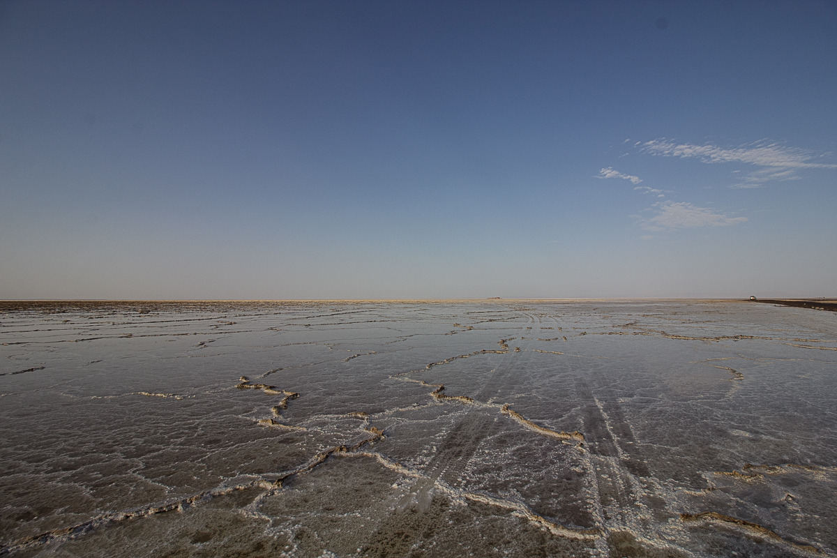 그렇게 몇 시간을 달려서 소금 호수라고 하는 곳에 도착했는데, 처음 도착한 모습은 실망스러웠다. 소금호수라고 하면 우리는 흔히 볼리비아의 우유니, 그것도 잔잔한 물이 고인 그 모습을 생각하겠지만 애석히도 여기는 그렇지는 못했다. 지나오는 길엔 육각형의 소금 결정들이 있는 모습을 보았고 메인 포인트는 물이 살짝 고여 있는 염전 같은 곳이었는데, 물의 양이 적어 완전히 반영이 비치는 모습은 아니었다.