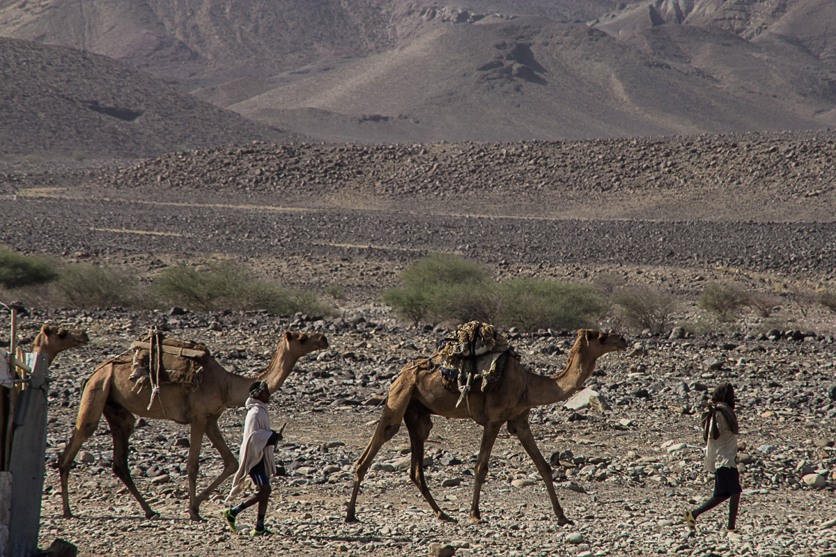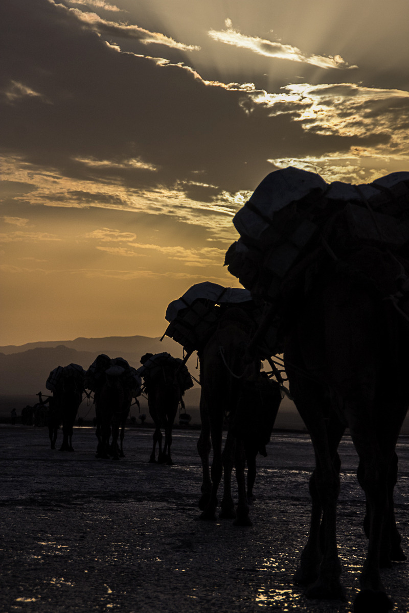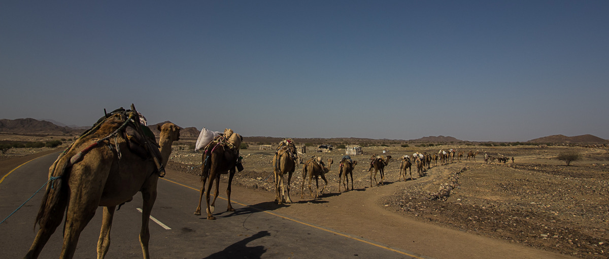 이 다나킬 투어에서 또 하나 빼 놓을 수 없는 흔하지만 볼때마다 신기한 장면은 바로 낙타 캐러밴! 수십 마리의 낙타들이 물건을 나르는 모습을 어디에서나 쉽게 볼 수 있다. 특히 1일차, 2일차에는 정말 많이 봤는데, 소금 광산에서 나오는 소금을 나르는 것이라고 했다. 통상 그렇게 한 번 소금을 옮기면 낙타 한마리를 통해서 얻는 순수익이 천원대도 되지 않는다고 했다. 그러니 하루 종일 옮겨야 1~2만원의 수익을 올리는 것이다. 아름다운 장관을 연출하는 낙타지만 그 이면엔 힘든 캐러밴 몰이꾼들의 삶도 느껴지기도 했다.