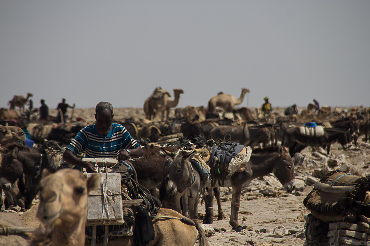 한참을 구경하다보니 벌써 내려오라는 신호를 가이드들이 주었다. 달롤을 뒤로 하고 다음 행선지로 향한 곳은 실제로 소금을 채취하고 있는 소금 광산이었다. 지천에 널린게 소금이지만, 실지로 사용할 수 있는 소금을 채굴하는 것은 또 다른 일이다. 양질의 소금을 찾기 위해 소금 채굴꾼들은 열심히 이를 찾아 나서기에 관광객들이 주로 가는 소금 호수보다 더 안쪽에, 메마른 지역에서 주로 소금을 채취한다. 수십, 수백마리의 낙타들이 앉아있고 그 주변에서 열심히 소금을 채취하고 있는 노동자들을 볼 수 있다.