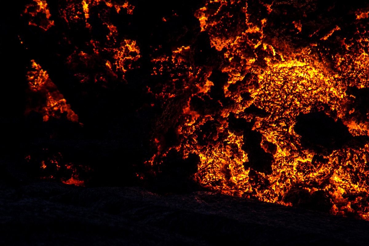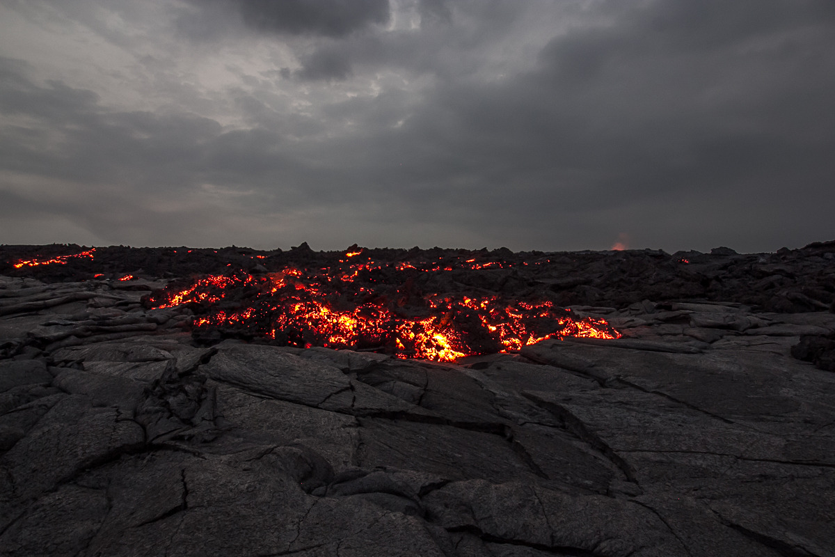 다행히 비는 그쳤다. 다시 걸어서 용암의 근처로 향한다. 여기서 부터는 땅의 촉감이 달라졌다. 그 전까지는 흙을 밟는 단단한 느낌이었지만, 오늘은 얇은 판을 밟는 느낌이랄까. 실제로도 앞에 가던 사람들이 땅이 푹푹 꺼져서 빠지기도 했다. 불을 비추어 자세히 보니 연필심 같은 재질로 땅이 되어 있었다. 아마 용암이 여기까지 흘러 내려와 굳어 천천히 식다 보니 약한 구조의 흑연같은 것이 만들어지지 않았나 싶다. 이과 특성이라고 자꾸 과학적으로 생각하게 된다. 중간 중간 멈추어 쉴 때마다 멀리서 보이는 용암의 사진을 담아보았지만 생각처럼 잘 되지 않는다. 덕분에 애꿎은 렌즈캡과 필터만 분실했다. 한참을 걸었을까. 가이드가 멈춰 세우기도 전에 따스한 열기가 느껴지기 시작했다. 바로 눈앞에. 불과 50m도 안되는 거리에서 붉게 이글거리는 용암이 어디에선가 부터 계속 밀려서 우리쪽으로 다가오고 있었다! 분출은 꽤 먼 곳에서 이루어지는 것 같았다. 용암이 분출되는 것이 멀리서 보였고 그로 인해 밀려온 용암이 우리 앞까지 온 것이다.