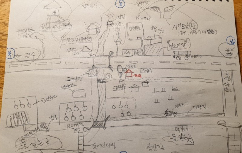작년 김은성 님의 <내 어머니 이야기>라는 책을 읽었었다. 이 책은 작가가 늙은 어머니와 대화하면서 들었던 내용을 어머니의 자서전처럼 엮어 놓은 책이다. 그중 책의 전반부에 작가의 어머니 고향 지도를 손그림으로 그려놓은 부분이 있었다. 아늑하게 만화로 그려낸 그 페이지를 보는 순간 나는 정겨움들이 느껴졌고, 이내 나도 내가 자란 마을 지도를 그렸었다. 그때의 노트를 뒤적이다 오늘 눈에 딱 들어왔다.