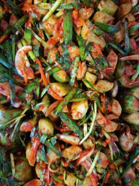 제육볶음이 만들어지는 동안 이제 오이에 부추와 당근이 들어간 속을 담기 시작한다.
