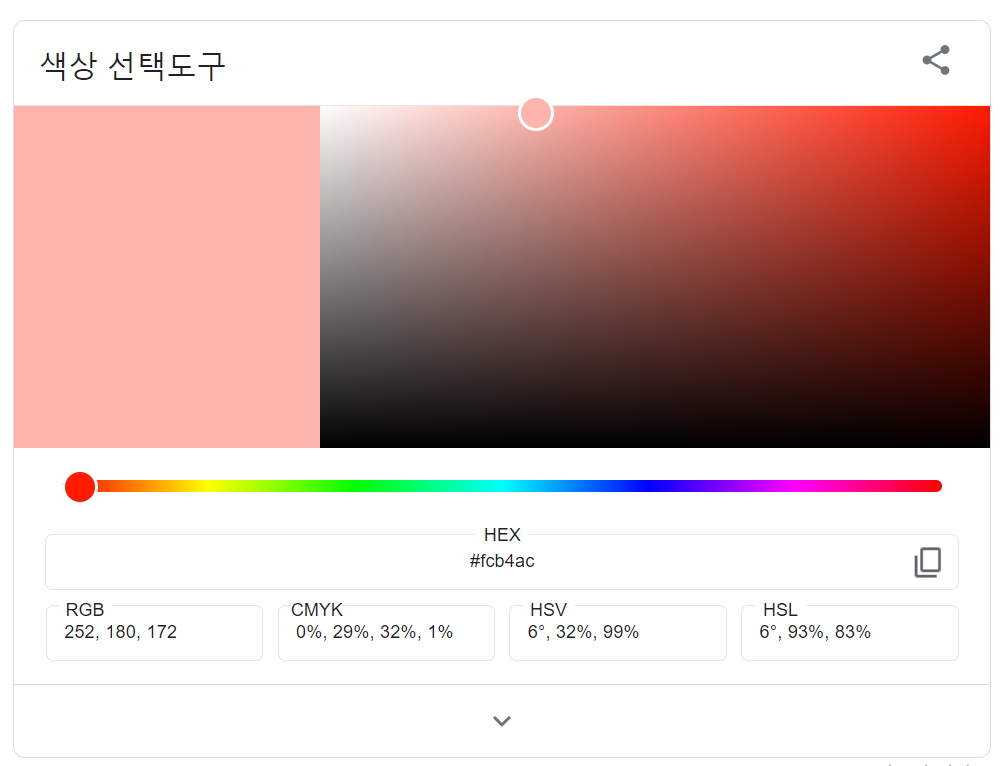 구글에 #FCB4AC로 검색하면 위와 같이 컬러의 스케일(Scale)과 좌표값을 동시에 알 수 있다. 베이비 코랄과 뮤티드 코랄, 어느 것이 더 어울리는 홋수명일까?