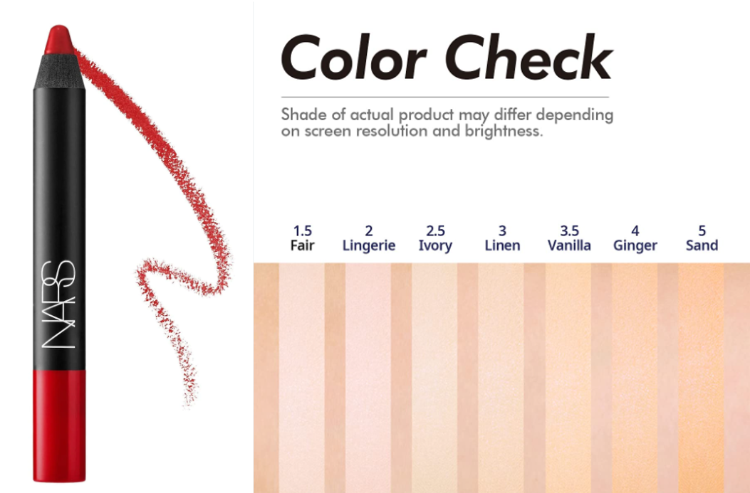 나스의 립 펜슬 드래곤 걸(Dragon Girl)과 클리오의 쿠션 발색사진. 홋수명만으로는 색상 유추가 쉽지 않다. (이미지 출처: 구글 검색, 하단 기재)