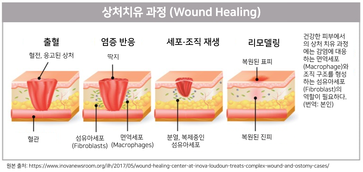 피부에 생긴 상처는 출혈 발생 시점부터, 완전히 아물 때까지 크게 4단계의 회복 과정을 거친다. 가장 오래 걸리는 단계는 마지막 단계로 경우에 따라 3년까지도 걸린다.