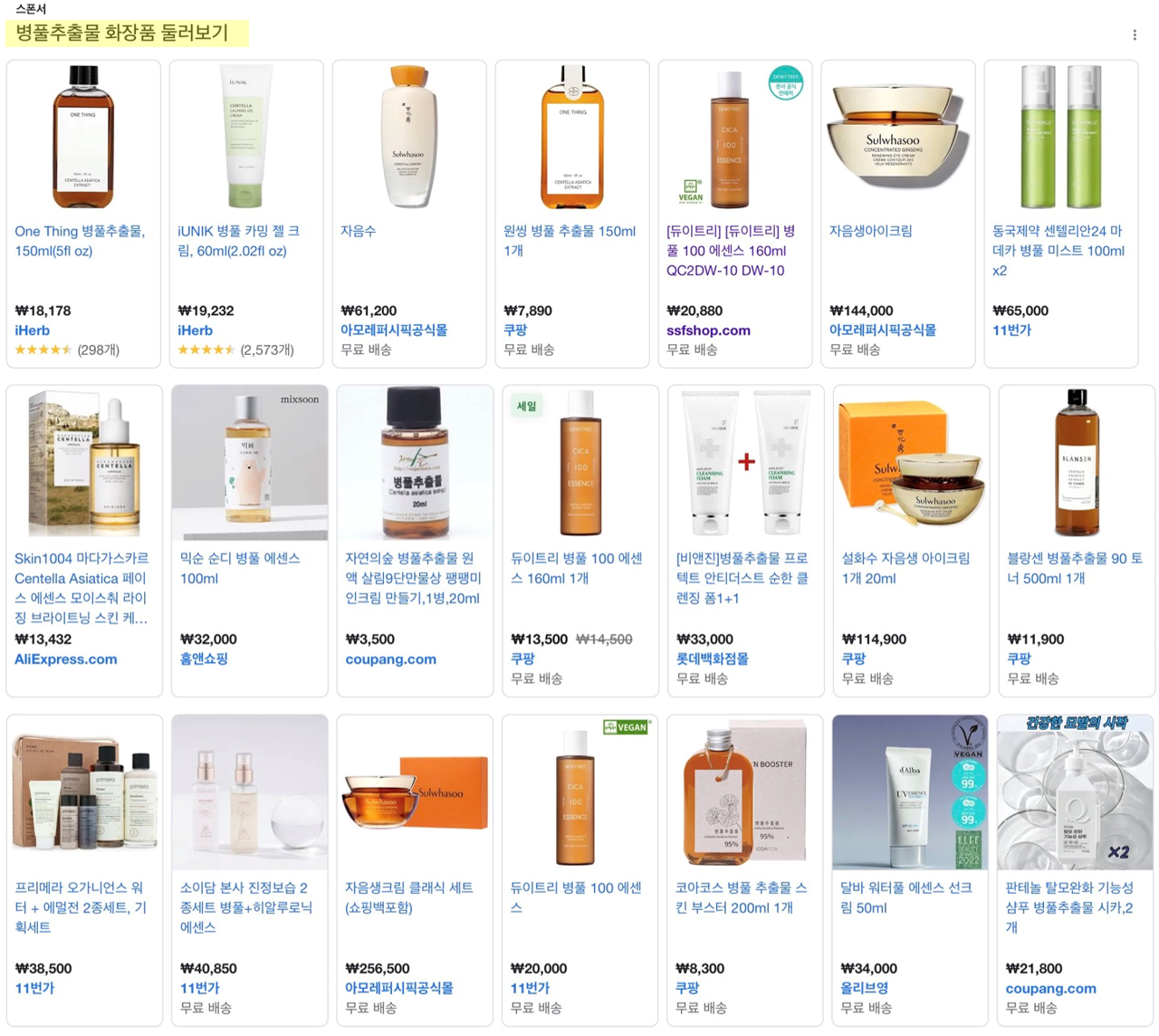'병풀추출물 화장품'으로 구글 검색 시 노출되는 수많은 화장품들