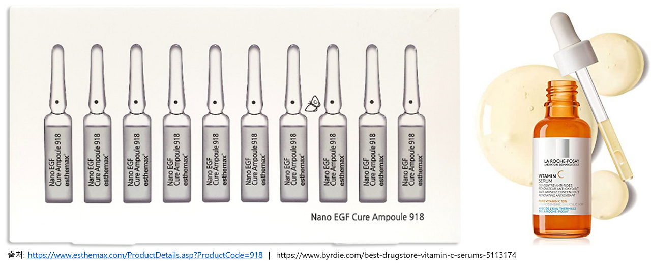 EGF는 피부 세포 뿐만 아니라 모든 세포의 성장 시기에 발현되는 인자이며 비타민 C는 세포 수준을 넘는 광범위한 항산화 효과가 있다. (이미지 출처: 사진 하단 기재)