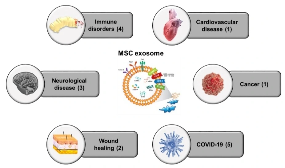 엑소좀 도입으로 치료 효과가 밝혀진 질환의 종류. 괄호 안의 숫자는 2021년 1월까지 완료 예정인 임상 갯수(출처: 하단 기재)