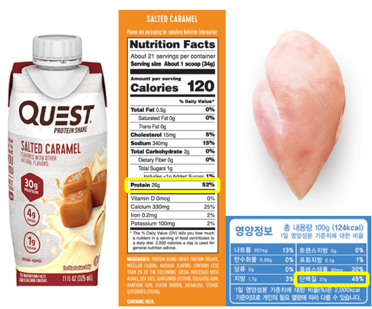 보충제 1회 제공량(34g) 대비 닭가슴살(100g)의 단백질 총량은 26:27(g)로 비슷하다. (출처: 구글 이미지 검색 후 편집)