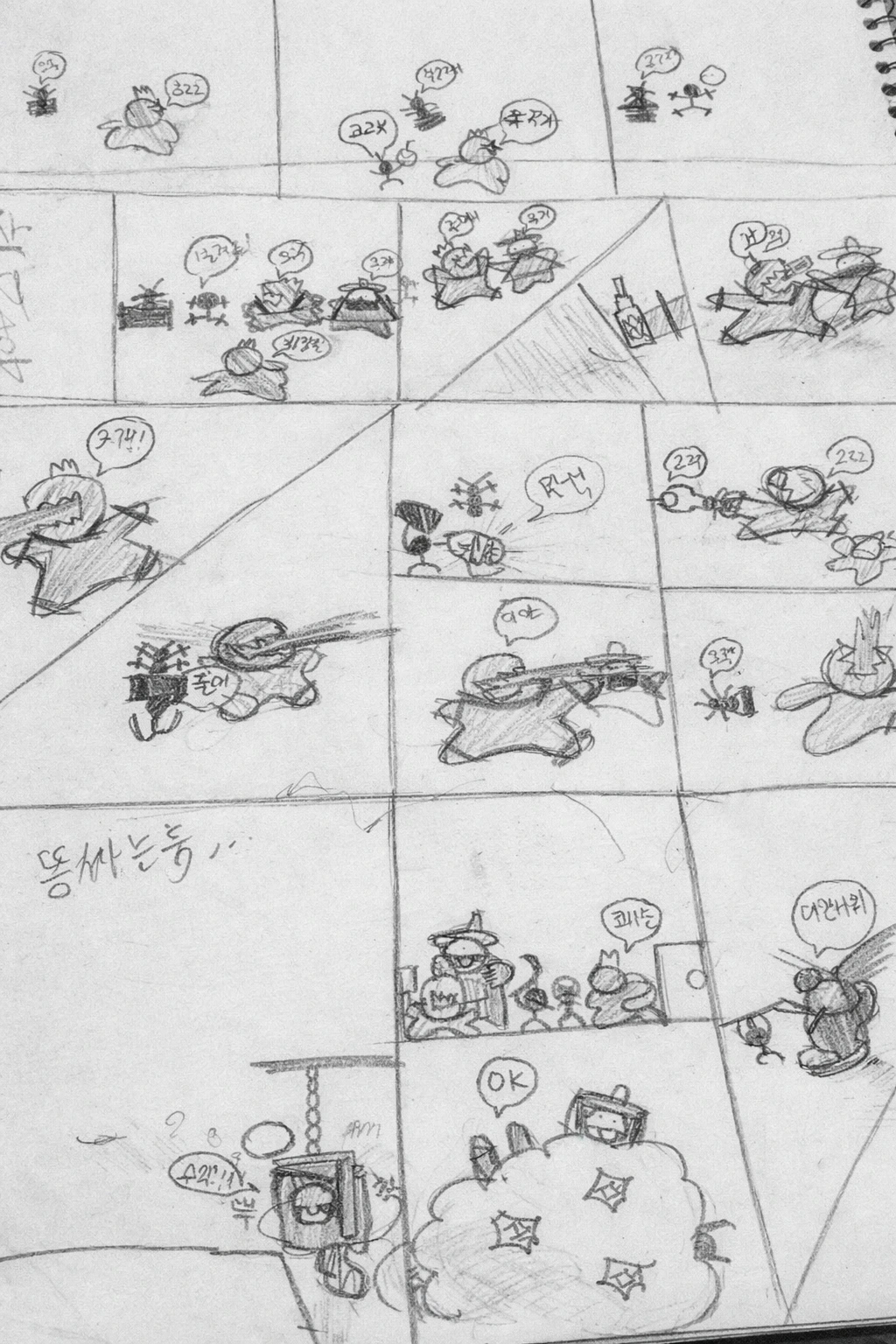 어제 그린 만화 제목이 ‘똥꼬에 똥꼬를 무는 이야기’라고 날더러 읽어보라는데, 글씨가 작고 받침이 틀려서 무슨 내용인지 통 모르겠다. 암호 해독 할 때도 이런 기분일까? 그래도 그림은 재미있다. 인물도 다양하고 저마다 표정도 제각각이다. 아들 머리를 한 번 쓰다듬어 줬다.