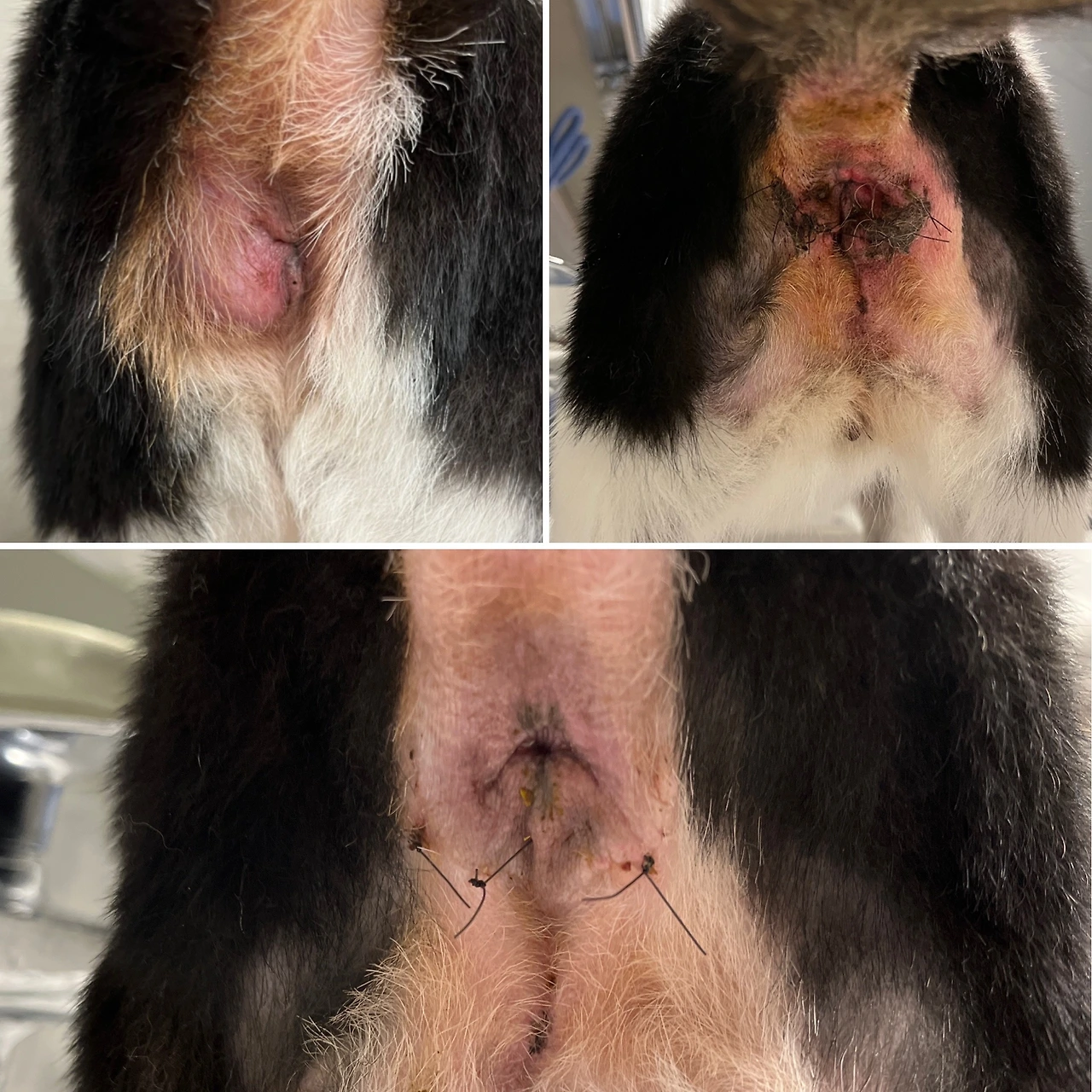 까망이는 한쪽이 하루 이틀 안에 터질 수 있는 위험한 상황이었기에 일단 당일 수술이 불가능하니 하루 입원 후 다음날 수술로 양쪽낭을 제거하는 방향으로 결정했다. 다음날 수술 중 확인해 보니 하루 사이에 심한 쪽이 안쪽으로 터져버렸고 퍼져버린 분비물을 어렵게 제거하면서 성공적으로 수술이 마무리되었다. 이후 괄약근에 힘이 잘 안 들어가는지 응가할 때마다 힘들어했지만 수술부위도 잘 아물고 이제 항문낭 걱정 없이 살 수 있으니 한편으로 다행이다 싶기도 했다,