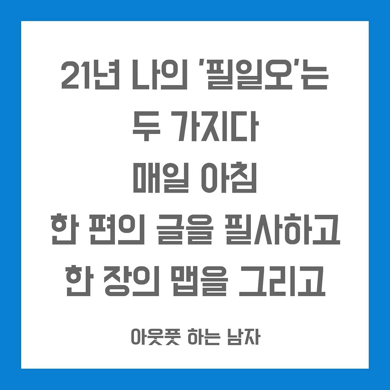 다가오는 21년의 '필일오'를 계획해본다. 하고 싶은 여러 가지 중 포기할 수 없는 우선적인 것들. 바쁘다는 어떤 핑계에도 흔들리지 않고 내 삶을 지켜내도록 실천해야 할 나의 가치.