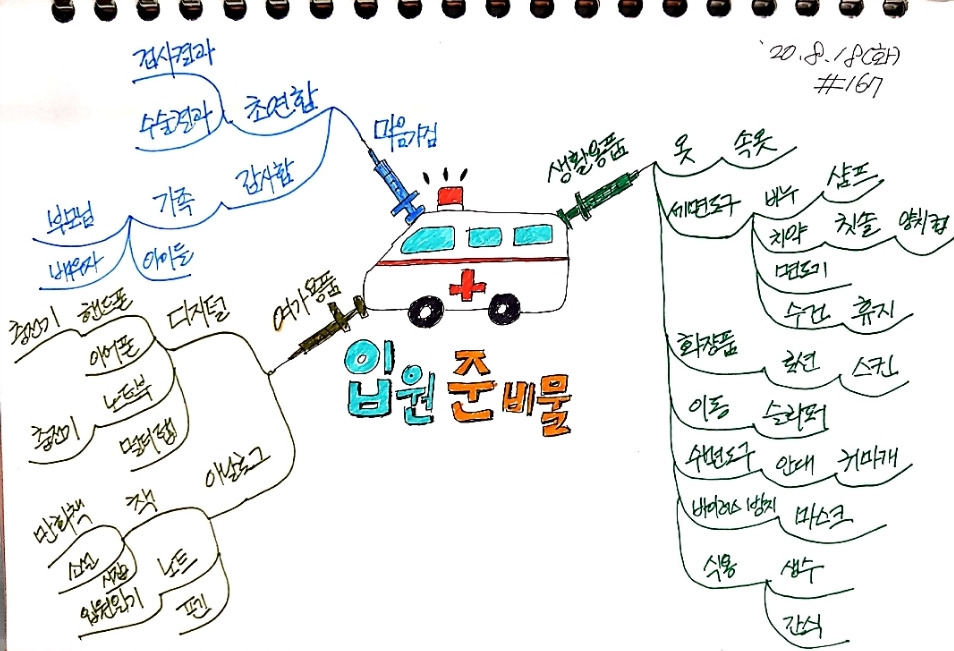 병원에 입원하면 남는 게 시간이다. 어찌 보면 입원생활은 시간과의 싸움이라 할 수 있다. 말 안 해도 당연히 핸드폰과 충전기부터 챙기겠지만 급히 챙기다 보면 가장 기본적인 것을 빠뜨릴 수 있다. 나는 개인적으로 노트와 필기구 지참을 추천한다. 핸드폰 또는 노트북으로 영상 보는 것도 몇 시간이지 하루 종일 영상을 보는 것도 고역이다. 영상만 보다가 없던 병도 생길 수 있다. 적당히 영상을 봤다면 멍~하니 쉬는 시간도 필요하다. 그 시간에는 노트를 꺼내 펜 가는 대로 낙서하기를 권한다. 아까 봤던 영상에서 재미있던 부분에 대한 감상을 적어도 좋고 오늘 하루 병실생활의 느낌을 끄적여도 좋다. 생각나는 대로 노트에 적다 보면 마음이 정돈되는 것을 느낄 것이다. 내친김에 간단히 한 두줄이라도 입원 일기를 써보는 것도 좋다. 퇴원 후 몇 자 적어놓았던 입원 일기를 보면 건강관리에 소홀해질 때마다 나를 다잡아 주는 건강지킴이가 될 수도 있다.